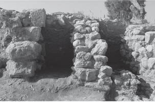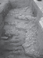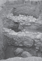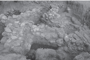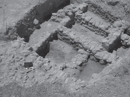 In most trial trenches west of Area A, structural material, pottery and brick parts of the superstructure of destroyed walls were detected. In one trench, parts of walls of two rooms were discovered (Fig. 3). On the floor of one of these rooms a circular carving containing structural material was opened during a later construction phase. This might have been used as a rubbish pit.