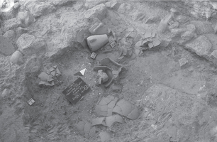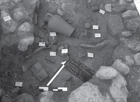 The finds in the southern trial trench inside the outdoor space of Sector Ι were particularly interesting. A storage complex of five rooms with an in situ deposit of vessels in one of them was uncovered (Fig. 4). In this room a deposit containing nine vessels was detected (Fig. 5), one of which is an intact amphora, two are bin-shaped vessels and the rest are one-handled cups. After the removal of the vessels, it became apparent that an older deposit phase with nine more vessels (single-handled conical and carinated cups) also existed.
