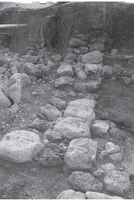 The walls of the complex are preserved only a few blocks high. No floors were identified; however the natural rock was located in all spaces. In the backfill of the rooms destruction layers were detected, containing abundant pottery, collapsed structure material, marine pebbles, hard calcareous soil, and brick fragments, which derived from the upper storey of the building. The discovery of many handless conical cups in the fills of the upper floor, which are dated to the MM IIIA period, should be noted. Apart from the handless cups, plenty of pithoi shards, and cooking pot shards with burning traces at their body were collected. In the south part of the storage complex another destruction layer with plenty of structure material was uncovered. On the west of the complex a circular carving was found on the height datum, potentially for the placement of a pithos or for workshop purposes.