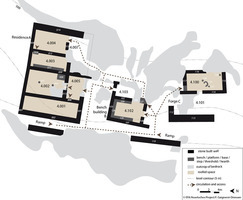 La résidence (bâtiment A) s’organise en trois niveaux sur un dénivelé Est-Ouest de 10 m. Les deux pièces à l’Ouest (4.001 et 4.002) avaient été fouillées en 2012 ; elles sont accessibles par un vestibule situé au Sud de la seconde. À l’Est du vestibule se trouve un espace probablement ouvert, une cour (4.007) qui donne sur la pièce 4.004 au Nord, dont on n’a fouillé en 2019 que l’effondrement des murs. Elle donne à l’Ouest sur une autre pièce (4.003) dont le mur Ouest est longé par une banquette.