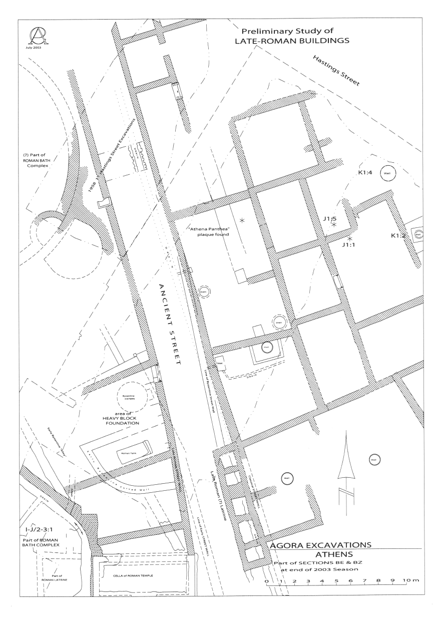 2) Rue Astingos (Hastings). — La démolition d'une maison a été suivie d'une fouille qui a mis au jour des vestiges de maisons byzantines orientées NO-SE, parallèlement à l'Éridanos, et incorporant de nombreux remplois antiques. Des niveaux de cendres et de scories suggèrent l'existence d'une activité industrielle dans les environs.