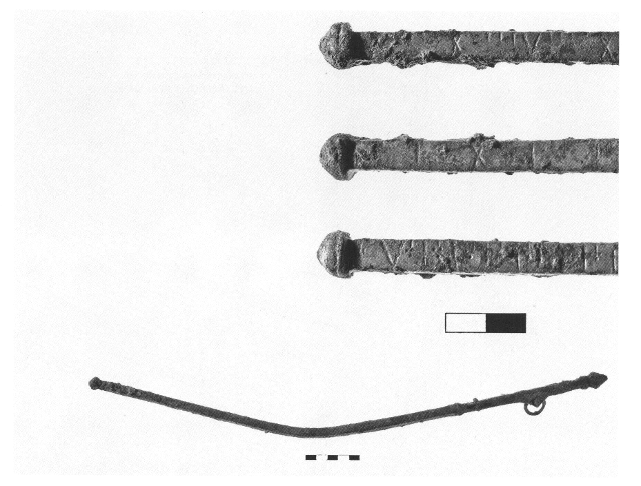 À l'Ouest de la rue, les fondations -en conglomérat surmonté de plusieurs blocs en calcaire -ap¬ partiennent à un puissant bâtiment, sans doute d'époque classique, dont la fonction demeure incertaine ; certains blocs d'époque classique réutilisés dans la fondation d'un bâtiment du début de l'époque romaine sont sans doute associés à cet édifice. Au Sud de cette puissante construc¬ tion, on a exploré les restes d'un bain construit au IIIe s. apr. J.-C. et abandonné sans doute en 396, lors du sac d'Athènes par Alaric ; des dizaines de tegulae mammatae ont été trouvées à l'intérieur du bâtiment. Un trésor de 431 monnaies de bronze datant du milieu du Ve s. et un solidus en or de Léon Ier (457-474) indiquent que cette zone souffrit de nouveau lors de l'attaque des Vandales vers 470. Son abandon final survint sans doute au moment de l'invasion slave (582/3), après quoi le secteur demeura en ruines pendant deux ou trois siècles. Une découverte intéressante a été faite dans les niveaux tardo-romains de la rue même (Ve-VIe s.) : une tige de bronze graduée provenant d'une balance (fig. 5).