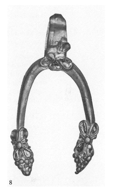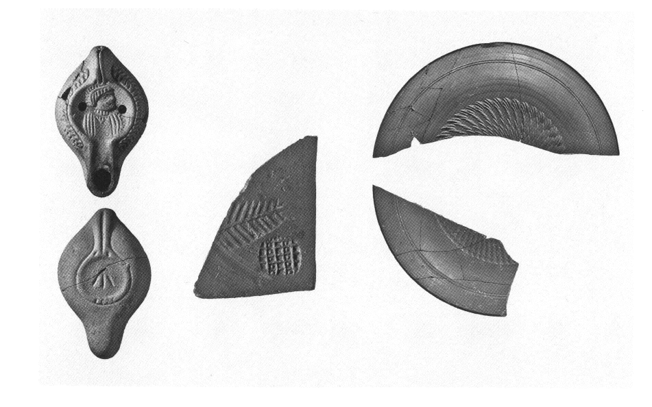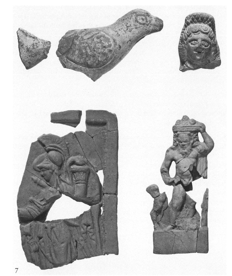 Au Sud-Est de la rue, un puits qui avait été exploré quelques années auparavant semble, d'après les recherches récentes, se trouver dans un espace non couvert et assurer l'approvisionnement en eau de plusieurs bâtiments. Dans toute cette zone, les vestiges architecturaux d'époque romaine sont très mal conservés à cause des remaniements et des importants travaux de reconstruction effectués à l'époque byzantine. Au Nord-Est de la rue, on a exploré un réseau dense de canalisations qui évacuaient l'eau des bâtiments vers l'égout central de la rue. Un puits fouillé dans ce même secteur a livré un riche mobilier céramique du IVe s. apr. J.-C. (fig. 6). Toujours dans la même région, ont été trouvées de nouvelles pièces en terre cuite, notamment des figurines et une plaquette représentant sans doute Athéna (fig. 7), issues de l'atelier de coroplaste qui était en activité dans le secteur du Ier au IVe s. apr. J.-C. (v. ibid., p. 697) ; un pendentif en or en forme de bréchet, décoré de rosettes (fig. 8), a été trouvé dans le remblai du Ier s. apr. J.-C. (mais il pourrait être antérieur de deux siècles).
