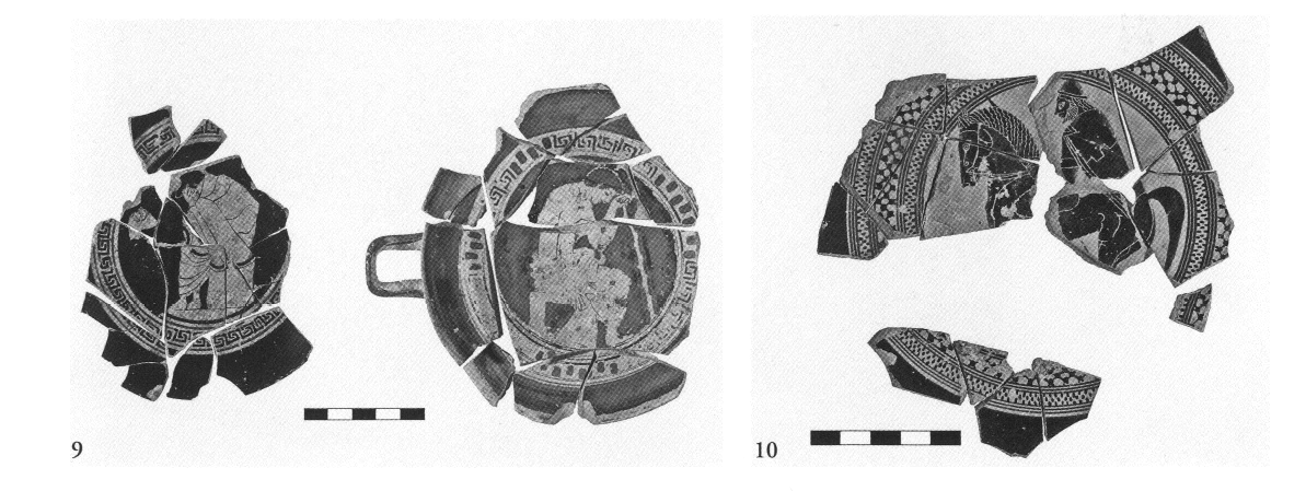– Section BE - Secteur du bâtiment commercial classique. Dans ce secteur, on a terminé les travaux de nettoyage à l'intérieur des pièces 1 et 2 ; sous le niveau de sol de la pièce 1 on a recueilli deux coupes à figures rouges dans un petit dépôt du Ve s. av. J.-C. (fig. 9). D'autre part, à l'occasion de la baisse du niveau de l'eau (pompage des eaux de l'Éridanos lors des travaux de la station de métro Monastiraki), on a poursuivi la fouille des couches profondes de la rue qui passe à l'Ouest de la Stoa Poikilè (v. plan, BCH 125 [2001] Chron., p. 790, fig. 9a) ; plusieurs niveaux d'époque classique ont été mis au jour et, au-dessous, un niveau contenant une abondante céramique très fragmentaire du VIe s., dont une coupe à figures noires portant la représentation d'un cavalier (fig. 10). Au-dessous de ce niveau, on a exploré une nouvelle chaussée de la rue, pavée de cailloutis : c'est là l'un des éléments les plus anciens et les plus importants du paysage urbain dans ce secteur, avant qu'il n'acquière son aspect monumental avec la construction de l'autel d'Aphrodite (ca 500 av. J.-C.) et de la Stoa Poikilè [ca 470 av. J.-C.). La présence de tombes de l'Âge du Fer à l'Ouest de la rue et de tombes de l'Âge du Bronze du côté Est laisse supposer que son tracé est beaucoup plus ancien ; c'était sans doute alors un simple sentier car on a atteint le rocher juste au-dessous du niveau de cailloutis.