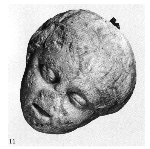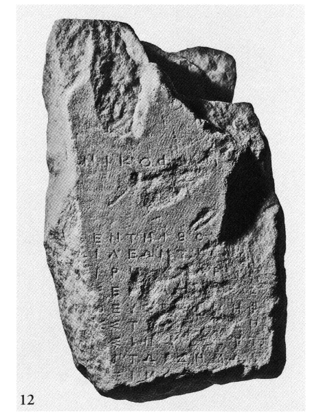 3) Éleusinion - Vesant Nords de l'Acropole. — On y a mené à bien l'exploration de deux puits, dont l'un, particulièrement profond (12 m) date de l'époque classique (500-480) et l'autre (prof. 6 m) de l'époque romaine ; au fond de ce dernier on a recueilli plusieurs vases intacts qui datent son utilisation de la 2e moitié du IVe s. apr. J.-C. ; du niveau inférieur du puits proviennent aussi : 1) une tête en marbre d'enfant (Eros ?) endormi (fig. 11) qui pourrait provenir du sanc¬ tuaire d'Éros et d'Aphrodite fouillé dans les années 1930 sur le versant Nord de l'Acropole ; 2) une inscription fragmentaire du IVe s. av. J.-C. conservée sur 10 lignes dont chacune comptait vraisemblablement 21 lettres (fig. 12) ; il s'agit du préambule d'un décret de 361/360 av. J.-C., quand l'archonte éponyme était Nikophémos ; les formules étant identiques à celles d'IG II.2 116, le décret se réfère peut-être à un traité entre Athènes et les Thessaliens.
