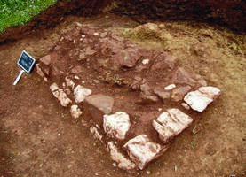 In the S part of the cemetery, in addition to common graves, excavation to date has revealed the following monuments along the line of the road. A rectangular structure (2.3m x 1m), of which the foundations are preserved: this is built of small and medium-sized worked limestone and local stone blocks, preserved in 2 courses to a total h. of 0.7m. No evidence for the superstructure survives. An empty elliptical pit was found behind and below the level of the foundations.