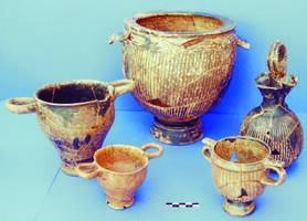 An elliptical pit (0.4m x 0.85m and 0.4m d.), cut into the bedrock, contained 5 bg vessels (an oinochoe, a krater, 2 skyphoi and a kantharos) of the L4th−E3rd Ct BC, carefully placed together (fig. 2). These may relate to rituals in memory of the dead. The pit was then covered with limestone slabs. A further 4 LCl−EHel vessels (a krater, 2 skyphoi and a trefoil-mouthed oinochoe) were found in a similar pit, 5m to the S of the stele monument detailed above.