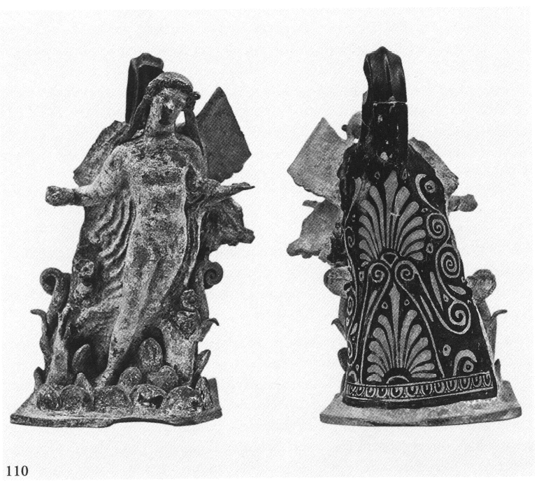 Côté Sud de l'autoroute.— 1) Nécropole antique. — Cent cinquante-neuf nouvelles tombes (56 bûchers et 103 inhumations) appartenant à la nécropole déjà connue (v. ibid) et un segment de rue pavée menant d'Akraiphia à Thèbes (v. AD 48 [1993] Chron., p. 177, 179) ont été mis au jour dans une zone de 100 x 30 m. Les tombes, qui s'échelonnent entre le VIe et le IIIe s. av. J.-C., appartiennent aux types déjà connus dans la partie fouillée de la nécropole (parmi les 103 tombes explorées, on en dénombre 49 à fosse, 33 à tuiles, 7 à ciste, 8 sarcophages et 5 sépultures en jarre). Les tombes à fosse, simples ou à degrés, datent pour la plupart du VIe et du Ve s. av. J.-C. ; le mobilier funéraire de certaines d'entre elles était particulièrement riche, notamment celui de la tombe T.450 qui contenait 46 vases et 19 figurines ; dans une autre tombe (contenant 43 vases et 2 figurines) le défunt tenait son épée de la main droite. On note aussi la découverte de trois objets d'un intérêt particulier : 1) un bandeau en bronze (couronne ?) d'époque archaïque décoré d'une scène de lutte entre Thésée et le Minotaure en présence d'Ariane (ν. ΕΥΠΠΟ 3 [ 1999] , p. 106, fig. 2) ; 2) un miroir en bronze dont le manche était une statuette de caryatide de style sévère (fig. 109) , la tête entourée de deux éros ailés, attachés à la partie inférieure du miroir ; sur le pourtour de celui-ci étaient aussi attachés des animaux (renard chassant lièvre) et une sirène ; 3) un lécythe à figures rouges et à décor plastique avec traces de polychromie (bleu, rose, doré) : un éros ailé volant au-dessus de vagues et de dauphins (fig. 110). Ce vase, qui daterait d'une phase avancée du IVe s. av. J.-C., provient de la même tombe que le miroir en bronze ; on suppose donc que la tombe fut rouverte pour être réutilisée un siècle plus tard.