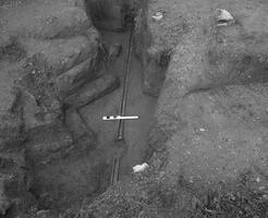 To the S of the plot, a clay pipe in the shape of a Π was found, following the downhill slope of the ground from E to W. It was discovered at length 6.40m, and consists eleven pieces 0.58m long. The floor was covered with white mortar. c.13m to the NE, seven damaged walls were found, also following the slope of the ground.