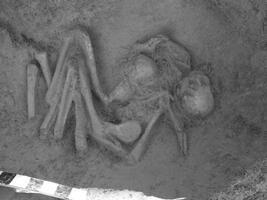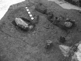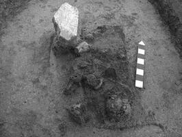 Seven burial areas showed evidence of cremation. They comprised pithoi or other large vessels placed horizontally on the ground, covered, and stopped. Various vessels were found outside of graves, including miniatures, skyphoi, glass beads, a small figurine of a man, and a bronze tool (Fig. 4).