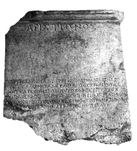 À la suite de la tempête du 8 juillet, une stèle funéraire peinte du IIIe s. av. J.-C. est apparue dans le comblement d'une canalisation de la fin de l'époque hellénistique (fig. 1). Cette stèle était celle de l'acteur comique Aristion, dont on sait qu'il fut deux fois vainqueur au théâtre de Dionysos et qu'il participa comme acteur aux Jeux amphictyoniques de Delphes en 265 av. J.-C. La stèle est inscrite et porte, en haut, le nom ΑΡΙΣΤΙΩΝΟΣ (« d' Aristion ») écrit en grandes lettres, et en bas, en caractères plus petits, une épigramme de six lignes qui se réfère à la vie et à la famille de l'acteur. L'espace qui sépare les deux inscriptions est occupé par un masque de comédie peint ; pour le texte et le commentaire de l'épigramme, v. K. HALLOF, J. STROSZEK, « Eine neue Schauspielerstele vom Kerameikos », MDAI(A) 117 (2002) [2003], p. 115-131, pl. 18-21, pl. couleurs IV.