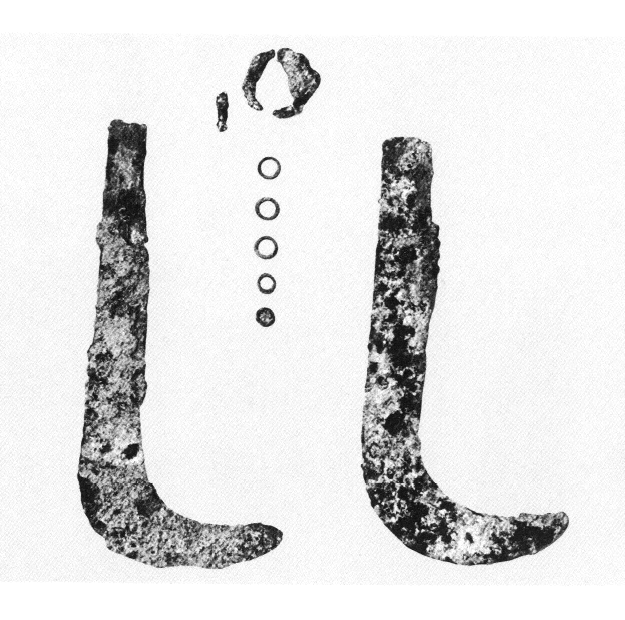 Vestiges hellénistiques et romains. — 1 ) Fermes. — Les vestiges d'au moins trois fermes, dont deux d'époque hellénistique et une d'époque romaine tardive. L'une des fermes hellénistiques (km 297, 200) a été complètement explorée : il s'agit d'un bâtiment de plan carré (6,20 m de côté) comportant deux pièces ; à l'intérieur de l'une d'elles on a trouvé deux faucilles en fer (fig. 125) ; dans l'autre, le dégagement d'un foyer circulaire a produit une lampe et une monnaie d'Antigone Gonatas en parfait état.