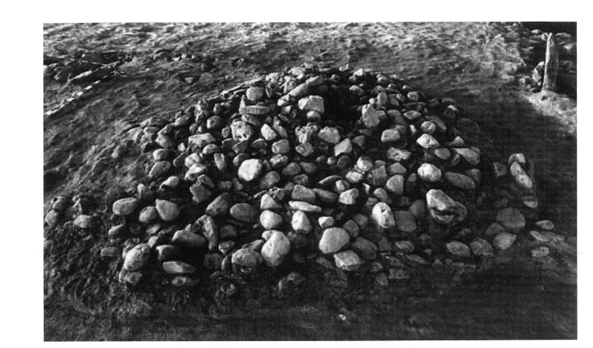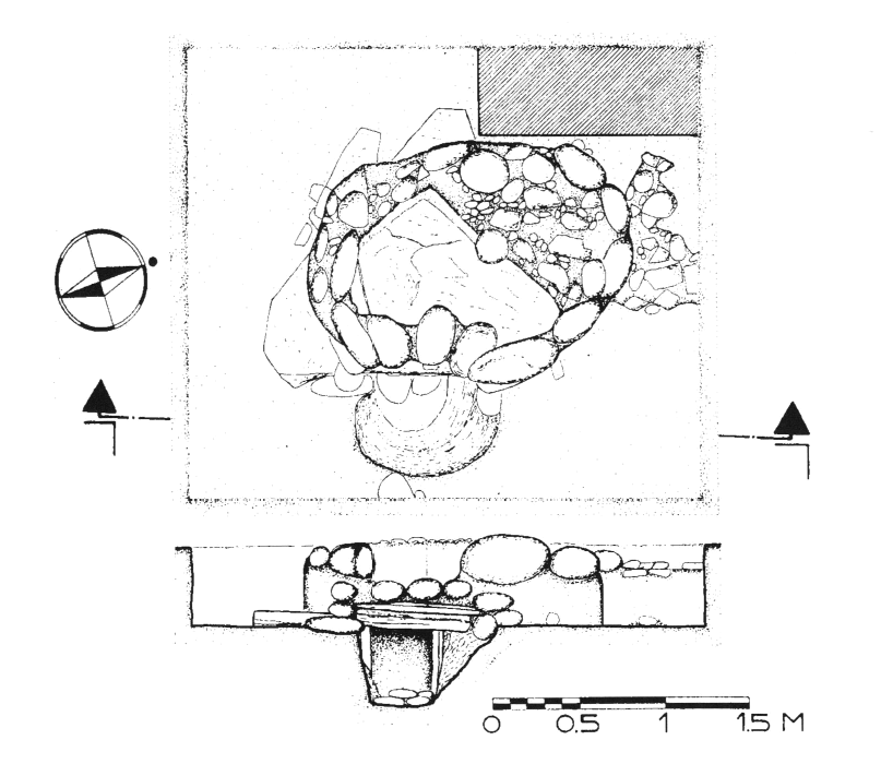 À proximité du tumulus, on a mis au jour un pavement en pierres de forme ellipsoïdale, délimité par de grosses pierres dressées, recouvrant une tombe à vestibule qui a été partiellement fouillée (fig. 2).