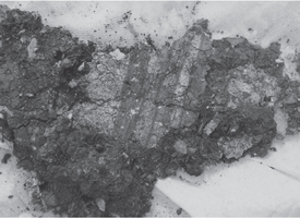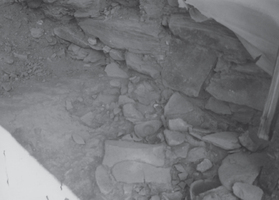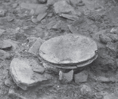 North of the pit, where during another season the neck of a closed overturned vessel (amphora) containing cup sherds and limpets was discovered, which as it appeared, was laying on a slab and was surrounded by small stones, concentrations of vessels and MM sherds were unearthed; these included fragments of cooking pots and cups, some of which were inside the cooking pots, or vials (Fig. 2) in hard soil with plenty of charchoal and occasionaly plaster. It became apparent that they were laying on an underlay of small wood shingles, some of which had a more orbital shape, creating cavities for some vessels, mainly vials.