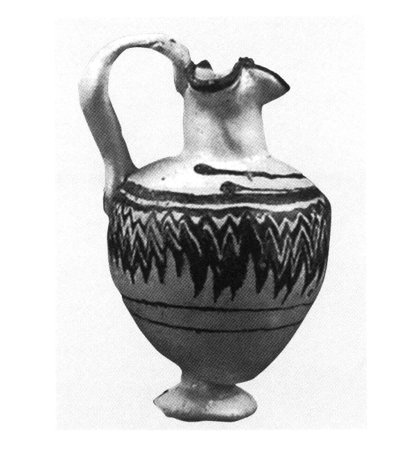 Nécropole Nord-Est. — Dans le quartier d'Anthokipoi, notamment sur un plateau surélevé au Nord-Est de la « table » (v. photos aériennes de 1916 et 1982 dans ΑΕΜΘ 17 (2003), p. 307-308), se trouve le noyau de la nécropole classique. Les fouilles dans neuf terrains ont mis au jour 282 tombes, appartenant pour la plupart au type de la simple fosse couverte d'une plaque de schiste. Les trois quarts des tombes explorées renfermaient un riche mobilier funéraire, parmi lequel un intéressant lot de protomés féminines en terre cuite d'époque hellénistique dont la plupart conservent les couleurs des vêtements, des bijoux et du visage. Nombreux sont les bijoux en bronze, en fer, en argent et en or, ainsi que les armes en fer et en bronze. On note enfin une petite œnochoé en verre (fig. 166) et un trésor de 88 monnaies en bronze de l'époque de Cassandre. ΑΕΜΘ 17 (2003) [2005], p. 299-310, en partic. 299-302 [A. Lioutas, M. Mandaki, E. Iliopoulou].
