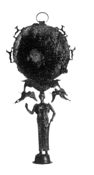 1) Nécropole Nord. — Dans la partie Nord de Kalligoni, dans le terrain Stavraka situé à 500 m du lieu-dit Frangokklissia, site de la nécropole Nord, on a mis au jour cinq tombes (trois sarcophages et deux tombes à tuiles). La découverte de tombes à cet endroit apporte des informations complémentaires sur la topographie de la ville antique, confirmant que la nécropole Nord commençait juste à l'extérieur du rempart et s'étendait plus loin vers l'Est. Parmi le mobilier recueilli dans ces tombes, qui datent du début du Ve au début du IVe s. av. J.-C., on signale un miroir en bronze dont le manche est une caryatide (fig. 1).