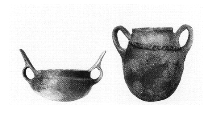 Habitat. Au Nord de la nécropole (champ Gotzou) on a exploré des vestiges d'habitations, notamment des soubassements de murs (rectilignes et curvilignes) en moellons, des sols pavés, des restes de foyers ainsi qu'un puissant mur courbe (0,90-1,10 m) qui devait délimiter l'espace habité tout en servant de mur de soutènement. La superstructure des murs, en briques crues, conserve les traces de chaînages en bois. Sous le sol de l'une des pièces se trouvait une tombe d'enfant contenant un petit skyphos. La céramique recueillie (fig. 2) confirme que l'endroit fut occupé de la fin de l'Âge du Bronze au début de l'Âge du Fer (XIIe-Xe s. av. J.-C.) et qu'il fut soumis à des influences venues de Macédoine et d'Albanie. AD 52 (1997) [2003] B'2, p. 557-559 [A. Douzougli].