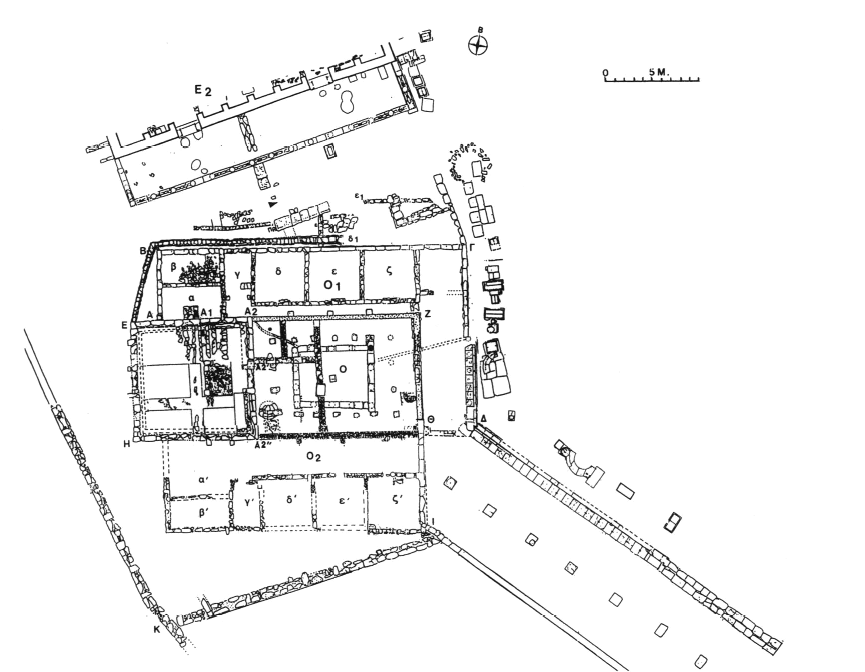 1 ) Prytanée. — La campagne de 2001 a porté, comme la précédente, sur le corridor (O2) (fig. 1) qui relie les parties Nord et Sud du prytanée (BCH 125 [2001] Chron., p. 882). L'objectif de ces travaux était la restauration du mur en briques cuites d'époque romaine (Α2"-Θ) qui délimite le corridor du côté Nord et qui était recouvert d'épaisses couches de remblais tardo-romains. Les données de la fouille ont confirmé que ce mur était fondé sur une couche postérieure à la destruction de la ville (167 av. J.-C.) et qu'il succéda à une colonnade, dont la présence est suggérée par les fragments de chapiteaux en poros réutilisés dans sa construction.