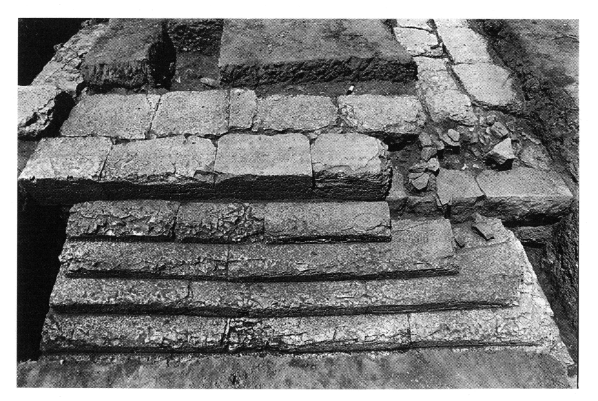 2) Portique Ouest du sanctuaire. — En 2002, on a repris l'exploration de ce portique, du côté Sud-Est du prytanée (v. ibid.), mettant au jour deux nouvelles bases de colonnes de la colonnade centrale, l'ensemble du stéréobate de la façade et le petit côté (Sud-Est) de la colonnade. L'extrémité de ce dernier était munie d'un escalier monumental de six marches (fig. 2), tandis qu'un autre escalier de deux marches se trouvait au centre de la façade du portique. Devant celle-ci on a mis au jour de nouvelles bases de statues, qui portent leur nombre total à douze. Au Sud du portique, on a exploré la suite du péribole du sanctuaire. À son extrémité Sud ont été repérées les fondations d'une tour rectangulaire qui suggère l'existence d'une porte. D'autre part, à l'Est du péribole, on a repéré un long mur dont les fouilleurs pensent qu'il pourrait appartenir au gymnase.