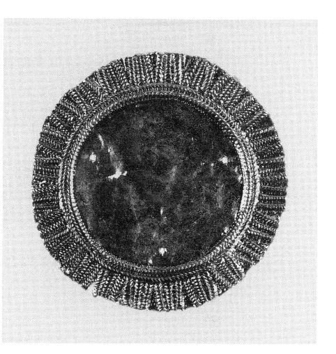 La couche mycénienne, particulièrement épaisse, renferme de nombreux vestiges architecturaux (briques crues, bois calciné) provenant de l'effondrement des murs et du toit de la Chambre au Trésor. La chambre elle-même n'a pas exactement la même largeur sur toute la longueur explorée (4,15-4,45 m). Le mur Sud, dégagé sur 8,70 m de long, est très épais pour un mur intérieur (1,10 m) ; sur son soubassement de pierre, conservé sur 1,28 m de haut, une partie de la superstructure en brique crue était encore en place. Sous les décombres de la superstructure de la Chambre, on a repéré une couche d'incendie qui descendait jusqu'au niveau du sol. C'est sur ce dernier qu'a été trouvé le disque en or décoré au repoussé (points et rayons sur le pourtour, fig. 3) déjà signalé dans BCH 122 [1998] Chron., p. 820 ; rien ne prouve que cet objet soit de facture orientale, comme on l'avait supposé : il pourrait aussi bien être d'origine mycénienne. Le long du mur Sud de la Chambre, on a mis en évidence une série de cavités dans le sol, sans doute destinées à recevoir des poteaux ou des vases ; deux séries de cavités du même type ont été aussi repérées le long du mur Nord. Le sol lui-même, en argile grise, s'étend au-dessous des murs qui délimitent la Chambre et semble donc être antérieur à la construction de celle-ci. Au-dessous du sol, on a repéré une fosse ellipsoïdale renfermant un grand nombre de fragments de peintures murales ainsi que quelques fragments de vases ouverts, provenant sans doute de la destruction d'un bâtiment plus ancien — sans doute la même qui, au milieu de l'HR IIIB, a ruiné le premier Kadméion voisin. On note enfin la découverte, dans la partie Ouest de la Chambre, d'une banquette en brique crue et d'une fosse rectangulaire qui appartiennent elles aussi au bâtiment qui a précédé la construction de la Chambre au Trésor (deuxième moitié de l'HR IIIB).