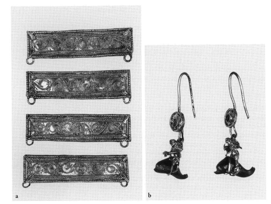 Bâtiments hellénistiques. Au cours des mêmes fouilles on a partiellement dégagé, au Sud-Est de la gare du chemin de fer, un vaste bâtiment d'appareil soigné comportant au moins trois pièces. L'aspect et l'organisation intérieure du bâtiment font penser à un portique (abritant des magasins ou des ateliers) qui serait tourné vers le Nord et appartiendrait à l'agora classico-hellénistique de la ville. Cette hypothèse est renforcée par la découverte, sous le sol de l'une des pièces, d'un trésor de monnaies et de bijoux à l'intérieur d'un puisoir (v. BCH 122 [1998] Chron., p. 820). Ces bijoux en or (fig. 4a-b) sont d'un intérêt particulier car ce sont les seuls bijoux béotiens que l'on puisse dater avec précision (fin IIIe-début IVe s. av. J.-C.*). Une pièce de la basse époque hellénistique, dont le sol était décoré d'un panneau peint, avait été explorée en 1987 dans le quartier de Synoikismos (angle des rues Haghiou Konstantinou et Smyrnis). En 1997, à l'occasion de travaux de voirie dans ce quartier, on a repris cette fouille et déposé la peinture, qui représente un aulète dans un rectangle entouré d'une zone à décor géométrique.