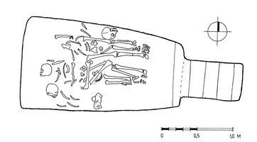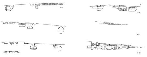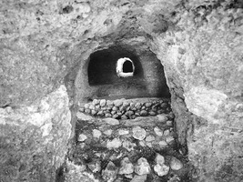 Au Sud du narthex, une ouverture carrée couverte par deux plaques mène vers un sous-sol creusé dans le rocher et composé de quatre pièces, portant des traces d’enduit sur les murs et les sols (fig. 2-4). Cet espace avait sans doute une destination funéraire, mais il ne reste que très peu de matériel, puisqu’il a été pillé. Deux monnaies en argent – dont un tornese d’Andrea Contarini (1367-1382) – ont été trouvées, ainsi que des ossements dispersés.