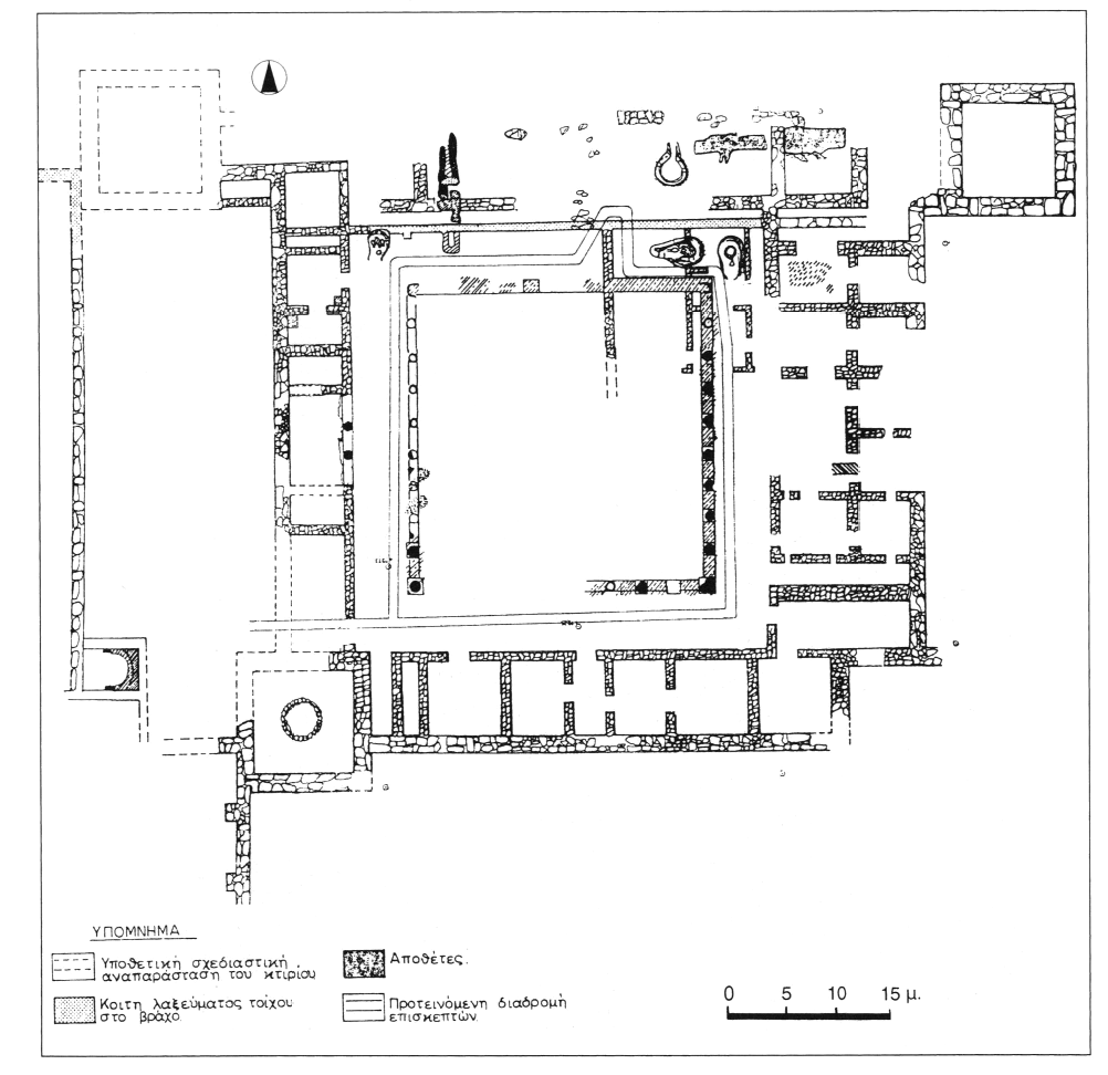 Dans l'aile Ouest, la partie centrale présente un aménagement particulier : la pièce centrale était munie, du côté du portique, d'une entrée monumentale à deux demi-colonnes in antis ; les murs de cette pièce, ainsi que ceux des pièces contiguës, étaient décorés d'enduits rouges et blancs. Quant au mur Ouest, de construction massive, il devait appartenir à un couloir couvert.