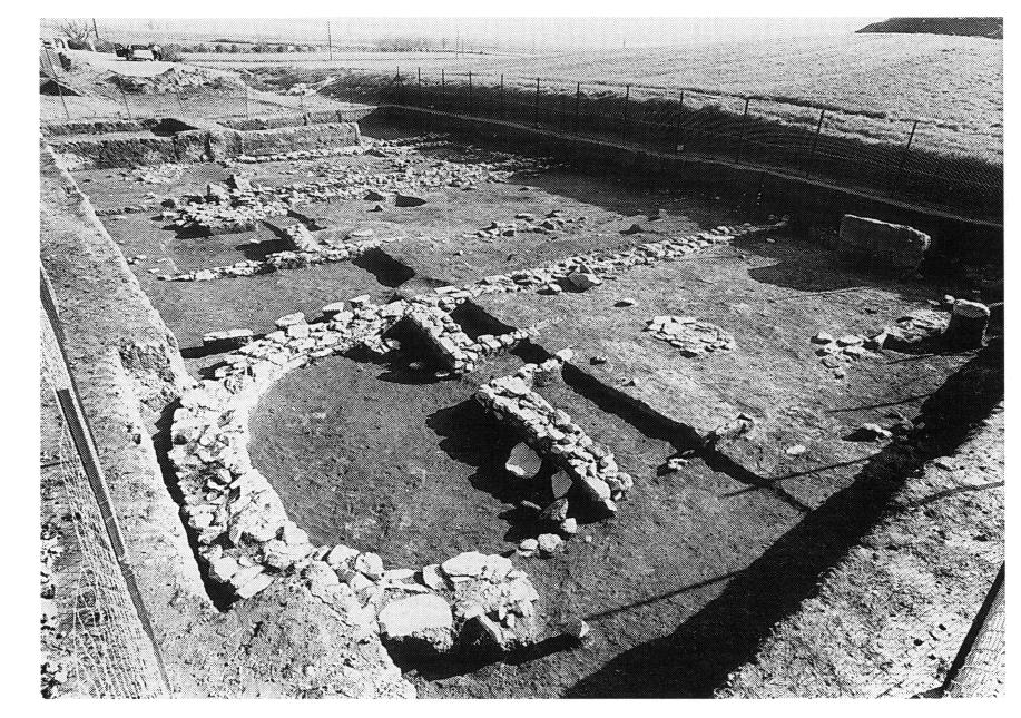 En 1997, quatre maisons absidales du Bronze Moyen (fig. 1) ont été fouillées aux abords Nord de la magoula préhistorique à l'occasion de travaux de voirie (v. simple mention dans BCH 122 [1998] Chron., p. 840 [Chronique n.12758]). Les quatre maisons sont parallèles (Nord-Sud), distantes de 0,35 à 2,50 m, l'abside au Nord. Leurs murs en brique crue étaient fondés sur des socles en pierre (larg. 0,35-0,70 m). La maison A, qui est la mieux conservée, a été fouillée sur 13,40 m de long (larg. int. 4,30 m) ; le mur de séparation entre les deux pièces conservait in situ la crapaudine en marbre de la porte, qui s'ouvrait vers la pièce absidale ; dans la pièce principale, à peu près au milieu de sa largeur, on a repéré un grand foyer circulaire (diam. 1,30 m), construit en dalles de schiste. Les trois autres maisons, moins bien conservées, n'ont été que partiellement fouillées. Les passages entre ces habitations étaient partiellement dallés ou pavés de cailloux.