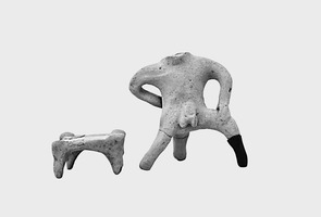 Dans le champ Papaggeli, au Nord-Ouest de Chéronée, on a mis au jour huit tombes de l’époque classique et hellénistique (quatre tombes à tuiles, deux tombes à ciste et deux tombes à fosse). Les offrandes des tombes à fosse, canthares à vernis noir et skyphoi, datent du Ve s., de même qu’une figurine ithyphallique (fig. 1). Les tombes à tuiles datent des IVe et IIIe siècles et contenaient peu de matériel : un lécythe dans l’une, un unguentarium et une petite oenochoè dans l’autre.