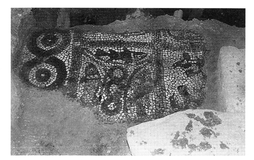 En 1997, la 7e EBA a poursuivi l'exploration à l'intérieur et autour de la basilique Saint-Georges (v. BCH 124 [2000] Chron., p. 886). À l'extérieur du côté Sud du monument, la fouille a mis au jour deux citernes, du côté Est plusieurs tombes à ciste sans mobilier. À l'intérieur, sous le dallage du narthex ont été repérés des lambeaux d'un pavement en mosaïque à décor floral et animalier de la fin du VIe ou du début du VIIe s. (fig. 1) ; la mosaïque avait été endommagée par la construction de six tombes réutilisant des marbres antiques ou byzantins (stèle, plaques de chancel à décor en relief). Dans le narthex on a aussi repéré des vestiges architecturaux appartenant à un état antérieur (sans doute paléochrétien) du monument et confirmant que l'église primitive était plus longue de ce côté. Des sondages dans la nef centrale ont mis au jour deux autres tombes, ainsi que des fragments d'architecture et des inscriptions réutilisés.