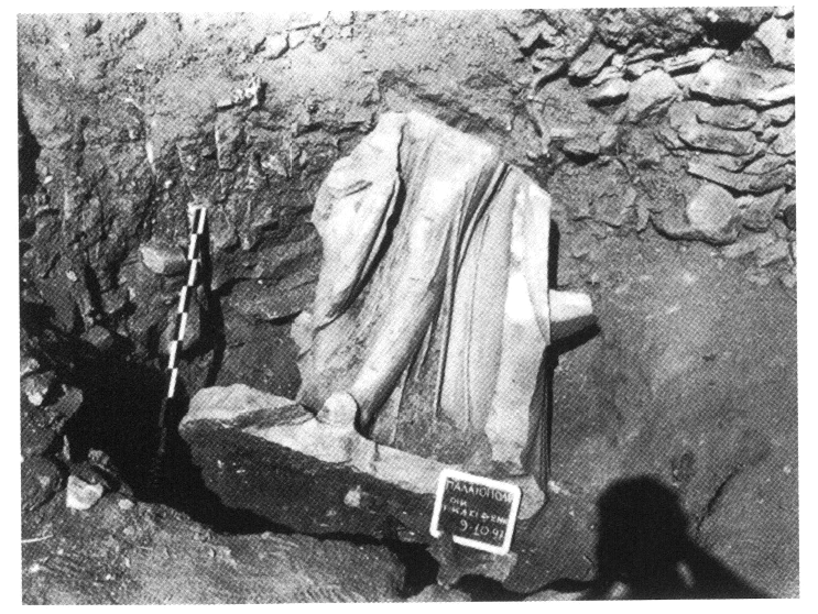 En 1997, un vaste édifice d'époque romaine, sans doute public, a été exploré lors d'une fouille d'urgence au centre de la vallée (terrain Kassidoni), juste au Nord-Est de la chapelle de Métamorphossi, dans la zone où se trouvent la plupart des édifices publics de la ville antique. Le mur Est du bâtiment mesure 30 m de long et il est conservé par endroits sur 1,50 m de haut. Sur le côté Nord on a repéré une niche tandis que du côté Ouest se trouve une citerne à enduit hydraulique conservée jusqu'à la hauteur de l'arcade (2,50 m). Réutilisée dans la construction de la citerne, une statue colossale féminine en pierre grise, d'époque hellénistique (fig. 198), représente une Nikè ou Aura. De nombreux éléments architecturaux en marbre découverts dans la fouille ou recueillis jadis au même endroit indiquent que l'édifice a connu plusieurs phases de construction et des remaniements successifs, de l'époque hellénistique jusqu'au IVe s apr. J.-C. Plusieurs éléments suggèrent que l'édifice pourrait être le gymnase de la ville, qui fut ensuite transformé en basilique. AD 52 (1997) [2003] B'3, p. 916-917 [Chr. Télévantou].