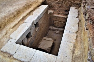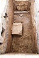 La fouille a mis au jour un monument funéraire qui avait été pillé : une tombe à ciste avec une ouverture de porte et des thékès. Cette tombe a été construite à l’intérieur d’une galerie creusée dans les sédiments sableux et argileux. Il s’agit d’une chambre unique (dim. 3,5 m x 2,5 m et 3 m de hauteur) maçonnée à partir de blocs de calcaire et recouverte de huit dalles dont sept étaient en place. La tombe avait une ouverture de porte qui était scellée par des blocs. A l’intérieur, les parois étaient enduites d’un stuc d’épaisseur différente pour le sol et pour les murs. Dans la partie Ouest de la chambre, se trouvait une banquette et deux thékès ou niches aménagées dans la paroi Nord.