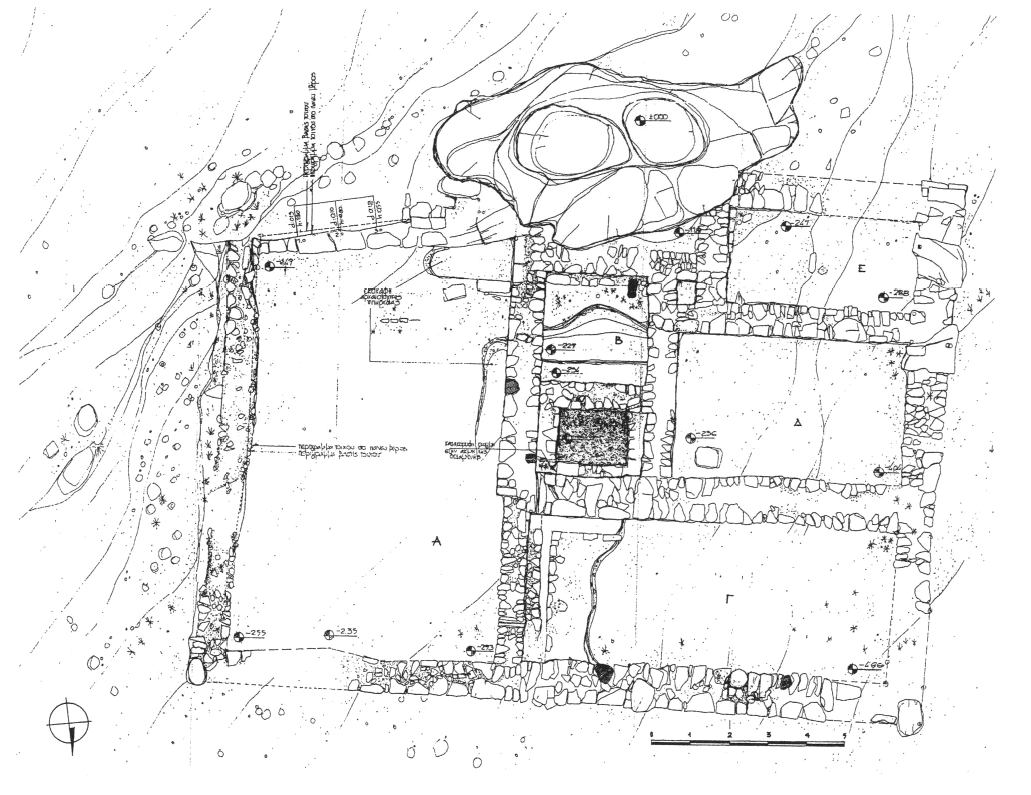1) Bâtiment de Sellada. — En 1998 on a achevé le nettoyage et la restauration de ce bâtiment situé au sommet de l'acropole (v. BCH 123 [1999] Chron., p. 801) et qui avait été fouillé en 1900, mais dont la cour, occupant toute la partie Est, n'avait pas été complètement dégagée (fig. 213). Les dimensions du bâtiment et son emplacement, à l'entrée de la ville, suggèrent une fonction publique, tandis que le caractère votif du mobilier recueilli, qui date des VIIIe-VIe s av. J.-C. (vases miniatures, figurines, œufs d'autruche, v. aussi ibid.), fait penser à un sanctuaire. La présence d'une citerne à l'intérieur du bâtiment et la découverte, à l'intérieur du dépôt de la cour, d'un grand nombre d'ossements d'animaux et d'une figurine de porc peinte laissent à penser que le sanctuaire était dédié à Déméter.