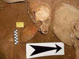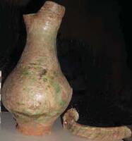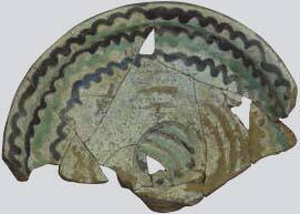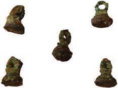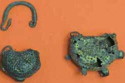 The deceased of grave 22 seems to have been struck twice in the head, and a few of the individuals in the cemetery were beheaded. A few ceramic utensils were placednear the hands or feet (Fig. 8,9), or at the pelvis. Different types of vessels (Fig. 10,11), glazed or unglazed were found, including also some bronze pieces (Fig. 14) and bronze earrings (Fig. 15). Some of the graves appear to date from much later than the destruction of the church, since parts of the marble architectural pieces and wall paintings were found in the graves.