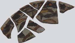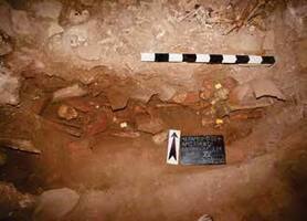 The excavation proceeded to the S, where large paving slabs were revealed. In the narthex, burial trenches were found (Fig. 4), many of which were covered with roof tiles (Fig. 5). Grave 22 contained four consecutive burials, two of which were children. Graves 4 and 18 contained five burials each. A total of 58 separate burials were identified. Most graves contained bones, some also contained tiles, pieces of small bronze, and grave 16 contained a ring (Fig. 6). Most of the deceased were placed in supine position. The deceased in grave 2 had on its chest a stone with an engraved cross on it, engraved with the acronym ‘IC XC NIKA’ (Fig. 7).