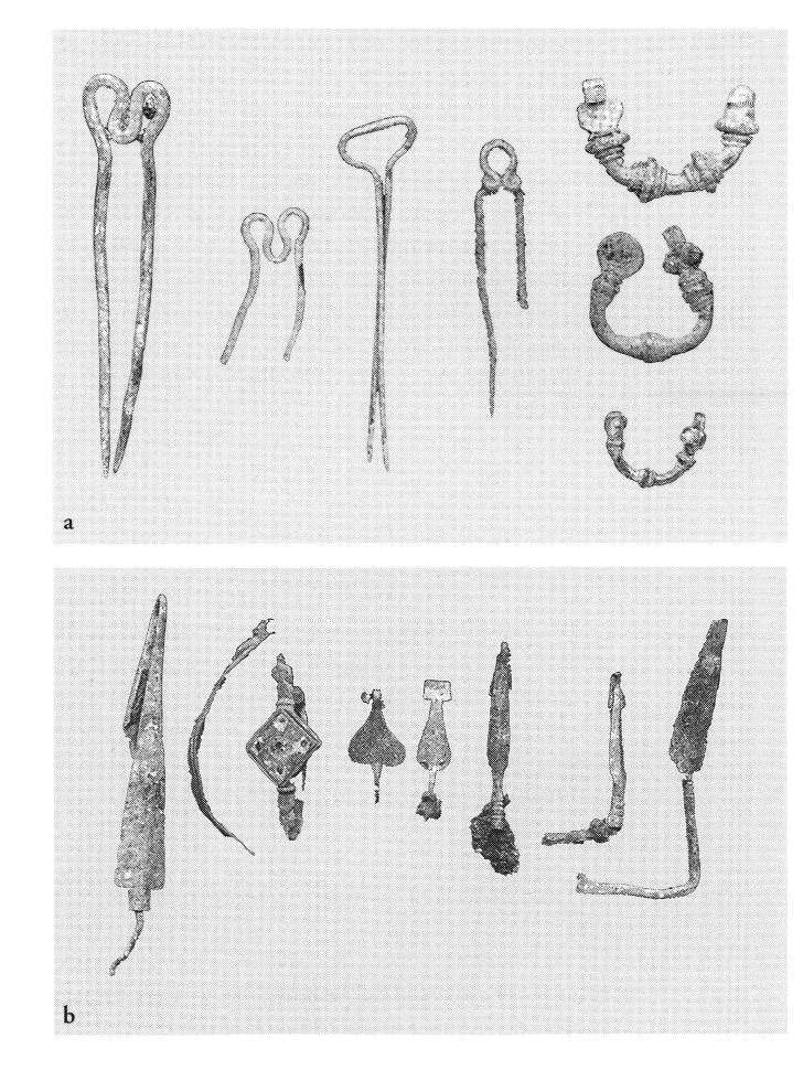 Au lieu-dit Porta, on a effectué, en 2000, une dernière campagne de fouille dans le sanctuaire d'Apollon (secteur B) (v. BCH 125 [2001] Chron., p. 929-930). Cette campagne a permis de préciser les limites Est et Sud du monument et a produit un riche matériel : vingt stèles votives en marbre, dont plusieurs avec représentation d'Apollon Citharède, huit d'entre elles portant des dédicaces à Apollon et une seule à Artémis ; huit fragments de sculptures en marbre appartenant sans doute à des statues d'Apollon et trois fragments de sculptures en bronze ; un sceau en bronze avec représentation de hibou, de tête de bélier et de lion ; un disque en plomb portant la lettre A ; quarante-neuf figurines hellénistiques appartenant à des types connus ; de nombreux bijoux en fer et en bronze, dont des fibules de types divers (fig. 1a-b) ; un grand nombre d'armes (56 pointes de flèches, 9 pointes de lance, 26 poignards) et plus de trois cents clous.
