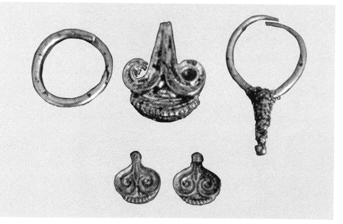 2) Nécropoles. — Une tombe à tholos mycénienne (4,50 m de diam.), en mauvais état, a été découverte dans le secteur Ouest de la ville (angle des rues Argyrokastrou et Korytsas, terrain Thalassinou) ; à l'intérieur de la chambre, deux fosses à incinération contenaient de la céramique, quelques ossements, dont le crâne d'un grand animal (cheval ?), ainsi qu'un lot de bijoux en or (fig. 216). Une quarantaine de tombes d'époque romaine ont été explorées dans deux terrains (Vréfonipiakou stathmou et Vassileiou) du secteur Ouest de la ville (rue Ethnikis Antistaseos) ; un puissant mur appartenait sans doute à un péribole funéraire ou à un soutènement.