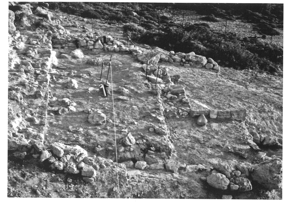 En 2004, l'exploration de l'établissement minoen a été reprise, sous la direction de M. Melas7 (v. BCH 127 [2003] Chron., p. 1060-1061). Les fouilles ont été centrées sur le secteur I, au Nord de l'habitation déjà explorée (v. ibid), mettant au jour un nouveau bâtiment ainsi que des éléments architectoniques appartenant aux vestiges déjà connus. Le nouveau bâtiment est organisé sur deux terrasses, dont l'une est en partie creusée dans le rocher et l'autre, plus haute, étayée par des murets de soutènement (fig. 221). Un mur médian (Nord-Sud) divisait le bâtiment en deux pièces : dans la pièce principale, partiellement conservée (6,5 x 5,5 m), on a repéré un muret (Est-Ouest) constitué d'une assise de blocs taillés, qui délimitait une plate-forme enduite d'argile verdâtre (lit ?). La pièce arrière, à l'Ouest de la précédente et à un niveau plus élevé, est allongée (6,5 x 2,5 m environ) et communique avec la pièce principale par une ouverture étroite dans l'angle Nord-Est ; dans l'angle Nord-Ouest, une construction semi-circulaire soutenait peut-être un pithos. Au Nord du bâtiment, on a fouillé les restes d'autres constructions mal conservées et repéré des indices de la présence d'une rue. L'étude de la céramique a donné des résultats intéressants : dans le remblai de la grande terrasse, notamment sous la couche d'occupation et de destruction de la pièce principale, on a repéré des fragments caractéristiques de céramique MM : tasses carénées ou hémisphériques à décor de type de Camarès, vases « à coulures », amphores à embouchure ovale, etc.