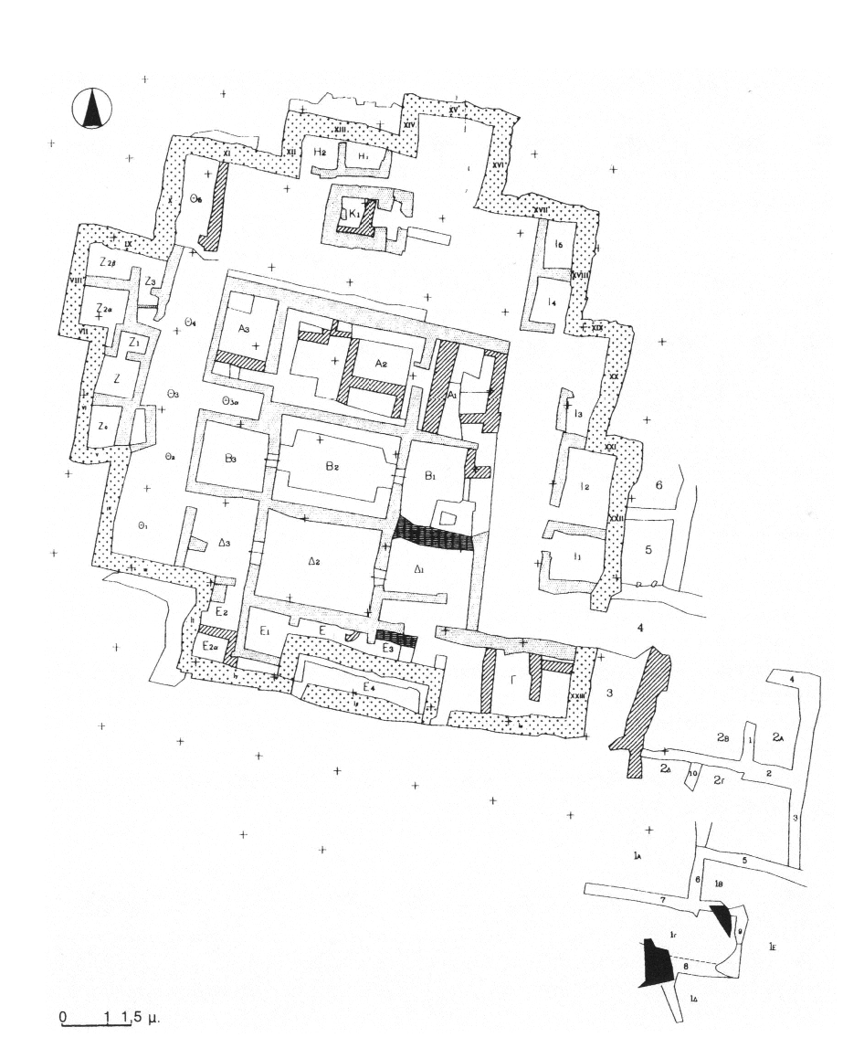 À l'intérieur du complexe, les recherches ont été centrées sur la petite pièce Zo (extrémité Ouest), la pièce Θ1 (angle Sud-Ouest), les espaces Ε et E4 (Sud), et le mégaron Δ, afin de préciser la stratigraphie et la séquence des différents états de l'édifice. Dans l'opisthodome (Δ3) du mégaron Δ (v. BCH 127 [2003] Chron., p. 1076-1077) on a mis au jour des fragments appartenant à trois pithoi, notamment au pithos décoré de bandes en relief incisées (v. ibid. fig. 288), qui a ainsi pu être restauré.