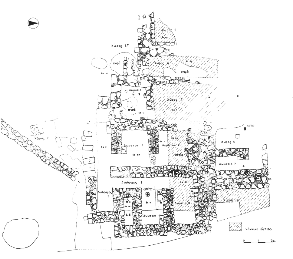 Lieu-dit Konostasi : les fouilles dans les champs voisins, Stratidakis (v. BCH 122 [1998] Chron., p. 966) et Kyriakopoulou, ont mis au jour un complexe du MM IA-MM IB comportant au moins neuf pièces ; on y a recueilli un grand nombre de vases en terre cuite, des vases en pierre et plusieurs pièces d'outillage lithique. Dans les niveaux supérieurs, on a recueilli de la céramique MR IIIC. AD 52 (1997) [2003] B'3, p. 1038 ; 53 (1998) [2004] B'3, p. 871 [M. Andréadaki-Vlazaki] .