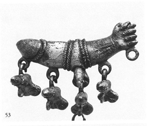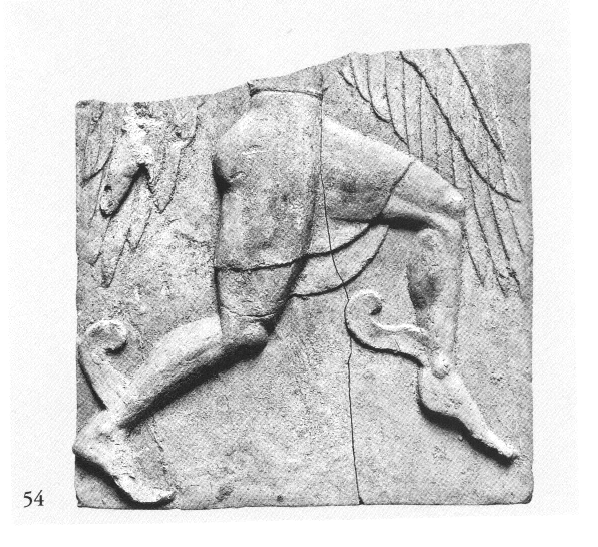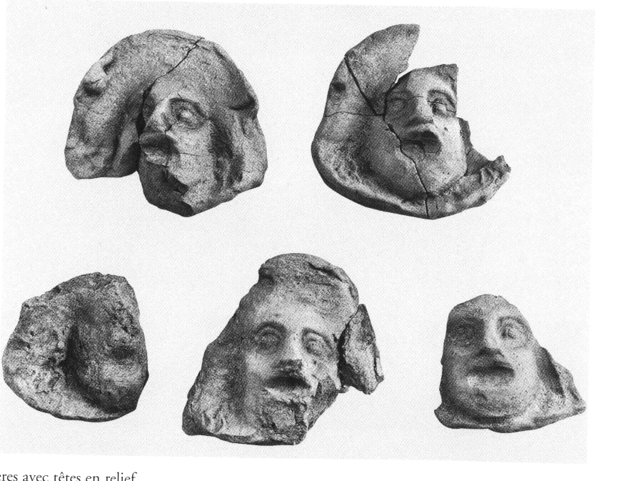 1) Habitations et autres constructions. — Des vestiges d'habitations d'époque romaine, fondées pour la plupart sur des bâtiments d'époque hellénistique, ont été explorés, surtout dans les secteurs Nord et Nord-Ouest de la ville moderne, notamment : – une maison avec cour, dont plusieurs pièces étaient pavées de mosaïques (motifs géométriques, Aphrodite) ; la maison était bordée d'une rue (larg. 3,75-4,15 m) munie d'une canalisation ; mobilier intéressant (fragments de plaquettes votives en terre cuite, figurines, lampes, monnaies en bronze) (angle des rues Platanista, Thermopylon et Tyndaréo, terrain Dimitropoulou) ; – une maison d'époque hellénistique dont une pièce était pavée d'une mosaïque représentant un lion et d'autres animaux ; parmi le mobilier plusieurs fragments de bols mégariens dont certains portent des inscriptions (rue Thermopylon 94, terrain Photopoulou) ; – trois pièces adjacentes appartenant à un bâtiment d'époque romaine (angle des rues Platanista, Vrassidou et Ananiou, terrain Koulogeorgiou et Tsiapa) ; – deux bâtiments d'époque romaine séparés par un espace non couvert traversé par une canalisation ; l'un d'eux, de construction massive, renfermait un pavement en mosaïque avec motifs géométriques et canthare d'où sortent des rinceaux (rue Pitanis, terrain Georgané) ; – des restes de constructions des époques hellénistique, romaine et byzantine (rue Triakossion, terrain Souchléri) ; – des vestiges s'échelonnant entre l'époque archaïque et l'époque tardo-romaine (parodos Saketta, terrain Vergadou) ; parmi le mobilier recueilli on note plusieurs lampes à vernis noir, des vases en terre cuite et en verre, plusieurs objets en os et en bronze (épingles, cuillère) ainsi qu'un objet de bronze en forme de phallus provenant sans doute d'un tintinnabulum (fig. 53) ; – des vestiges architecturaux d'époque romaine et byzantine ainsi qu'une fosse-dépotoir peu profonde contenant un riche mobilier votif archaïco-classique (céramique, plaquettes et figurines en terre cuite), dont une plaque en terre cuite avec représentation de Méduse en relief (fig. 54) ; il s'agit sans doute d'un dépôt provenant d'un sanctuaire proche ; – les restes de trois maisons hellénistiques organisées autour d'un espace non couvert qui renfermait un puits (rue Kyprou , terrain Koutsoviti) ; – dans le terrain des Anciennes Prisons, des vestiges architecturaux épars de toutes époques et de la céramique s'échelonnant entre l'époque géométrique et l'époque paléochrétienne ; parmi la céramique classique, on note un fragment à figures rouges représentant une figure masculine à himation portant une torche (angle des rues Léonidou et Dioskouron , terrain Pavli-Mavroyanni) ; – dans la partie Ouest de la colline de l'hôtel Xénia, un petit dépôt contenant de la céramique hellénistique ; la présence d'un vase déformé par la cuisson suggère qu'il pourrait s'agir du dépotoir d'un atelier céramique (rue Archimidou, terrain Varzakakou) ; – dans le terrain Zacharaki, rue Staufert (v. BCH 127 [2003] Chron., p. 783), de la céramique géométrique et du mobilier d'époques tardo-classique et hellénistique, parmi lequel de nouveaux fragments d'acrotères avec des têtes en relief (fig. 55) ; – dans la région de Pitani, tout près du site archéologique de l'acropole de Sparte (terrain Florou Stamatopoulou) , les vestiges d'une maison d'époque romaine à cour à péristyle, dont les murs étaient décorés de peintures murales (fouilles de la 5e Éphorie des antiquités byzantines) ; – des vestiges de bâtiments des époques tardo-romaine et byzantine (place centrale de la ville et rue Alkmanos, v. aussi infra « vestiges byzantins ») .