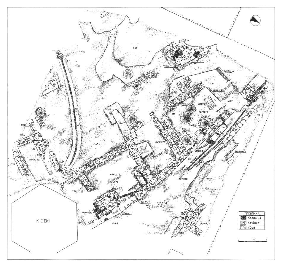 Un vaste bâtiment tardo-romain et paléochrétien dont on a reconnu cinq pièces (fig. 56) a été exploré rue K. Paléologou (cour de la 2e École communale), dans un secteur où d'autres édifices importants pour la topographie de la ville de cette période avaient déjà été découverts. Les pièces du bâtiment forment un angle (Γ) bordant les deux côtés d'une cour ; au Nord-Ouest de celle-ci on a repéré un nymphée ; à l'extérieur du bâtiment (Nord) passait une rue (larg. 4 m). D'après le mobilier trouvé dans deux pièces (III, IV), on suppose que celles-ci étaient destinées au stockage ; à l'intérieur de ces pièces, on a découvert trois tombes à ciste d'époque tardo-romaine (deux dans la pièce III et une dans la pièce IV) ; une tombe à tuiles d'époque byzantine, appartenant à un enfant, a été trouvée dans la pièce V. D'un intérêt particulier est la découverte de deux tables en fer à cheval, l'une en pierre l'autre en marbre, malheureusement hors contexte.