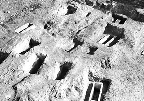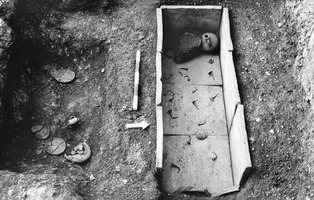 La fouille du terrain Armyrioti, à l’Ouest d’Achinos, a livré une partie de la nécropole hellénistique de la ville antique d’Échinos. Vingt-quatre tombes ont été dégagées : 5 tombes à ciste, 14 tombes à fosse, 3 tombes à tuiles, un sarcophage en pierre et un larnax en terre cuite. Elles présentent une orientation commune (Est-Ouest) et elles contenaient un riche mobilier : céramique à vernis noir, lampes, unguentaria, agrafes et boucles d’oreilles en bronze, et figurines (fig. 1-4).
