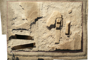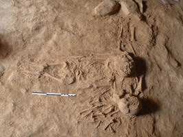 La fouille de la chambre funéraire a été très longue, car elle était presque entièrement comblée par du sédiment stérile, infiltré lors des pluies et de l’arrosage agricole. Sur le sol de la chambre reposaient les corps de quatorze défunts. Selon les observations anthropologiques, ils étaient placés sur des tréteaux (vraisemblablement posés sur des pierres qu’on a retrouvées sur le sol), enveloppés dans des linceuls. Aucun cas de réduction n’a été constaté : les corps ont été posés les uns à côté des autres et, en partie, les uns sur les autres, et la tombe a été fermée lorsqu’il n’y avait plus d’espace disponible. Le matériel (amphores commerciales phéniciennes, jarres et bols Plain White) était placé de part et d’autre de l’entrée et, dans une moindre mesure, dans le coin Nord-Est de la chambre. Les cas d’objets associés à des défunts sont très rares : bols et lampes-coupelles tenus dans les mains de trois adultes ; perles autour du cou d’un enfant. Enfin, les corps de deux des enfants (entre 1 et 4 ans) étaient disposés en croix contre et en partie sur un squelette d’oiseau (fig. 2). Cette observation n’est pas sans évoquer les nombreuses représentations antiques d’enfants avec des oiseaux, si communes en Méditerranée : pour ne citer que des exemples chypriotes, on mentionnera la stèle d’Aristila de Salamine, découverte à Marion, et les nombreuses statuettes de « temple-boys » à oiseau.