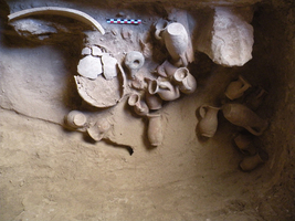 Dans la paroi Est du dromos, près du stomion, une plaque de gypse dissimulait une « cachette », semblable à celles qui avaient été découvertes en 2012. Dans cette niche, creusée dans le rocher, ont été mis au jour trois biberons et de petits bijoux (bracelets et anneaux en bronze). Ces offrandes, qui ne sont jamais associées à des ossements, posent d’intéressantes questions concernant la relation entre les vivants et les morts : il ne s’agit pas d’offrandes individuelles, mais d’offrandes destinées à une communauté de morts, sans doute familiale. C’est, par ailleurs, une pratique généralisée, du moins dans la nécropole de Pervolia et du moins à l’époque classique (Ve-IVe s. av. J.-C.) : toutes les tombes explorées jusqu’à présent possédaient des « cachettes » similaires.